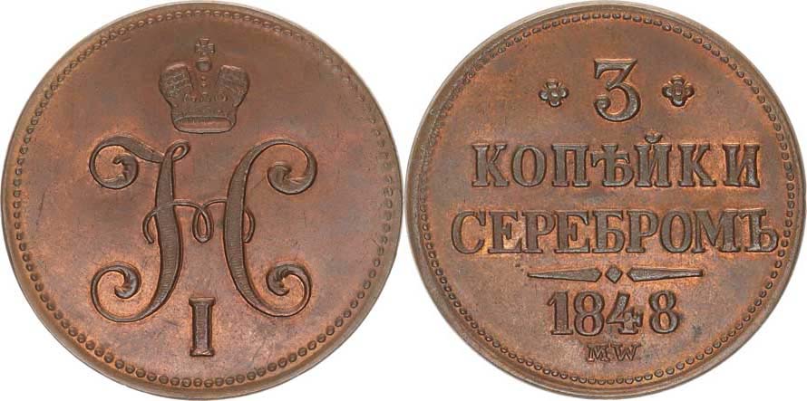 3 Kopějka 1848 MW, Varšava "KOPIE" Cu 31,09 g