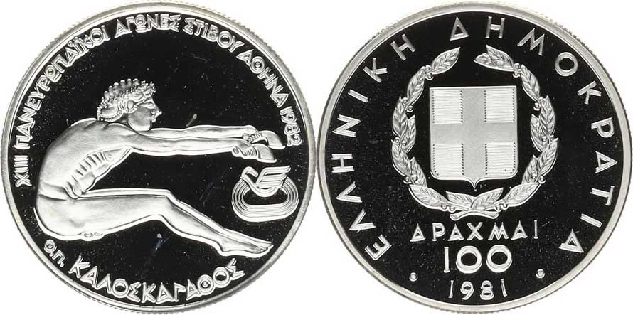 100 Drachmes 1981 - XIII. panevropské hry, skok daleký KM 12 5 Ag 900 5,78 g kapsle