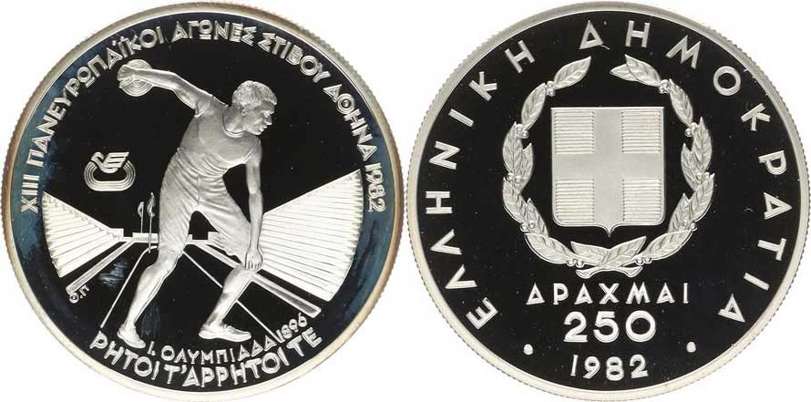 250 Drachmai 1982 - XIII. panevropské hry, diskař KM 137 Ag 900 14,44 g kapsle