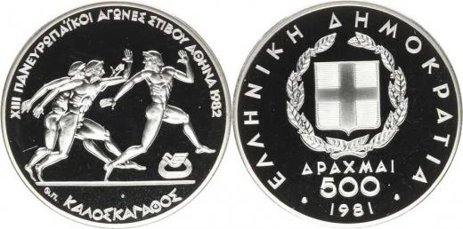 500 Drachmai 1981 - XIII. Panevropské hry, antičtí běžci K M 127 Ag 900 28,88 g kapsle