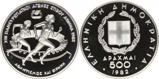 500 Drachmai 1982 - XIII. panevropské hry, běh žen KM 140 Ag 900 28,88 g kapsle