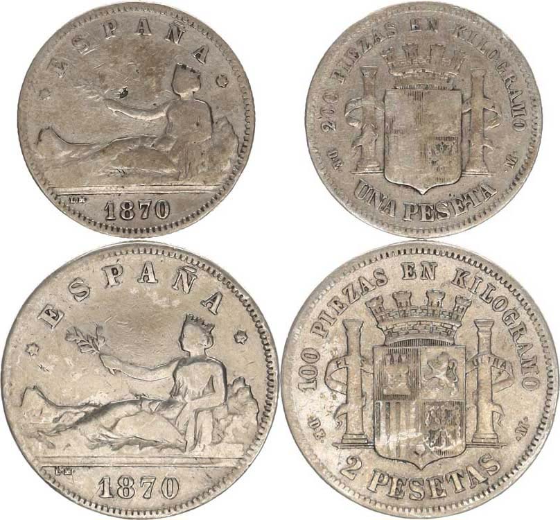 2 Pesetas 1870(?) DE-M KM 654 Ag 835 10 g 1 Peseta 1870(?) DE-M KM 653 Ag 835 5 g 2 ks