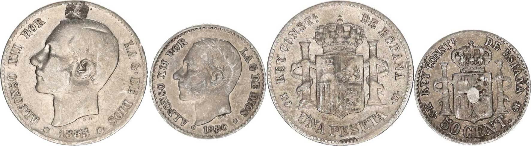 1 Peseta 1885 MS-M KM 686 Ag 835 5 g "R" 50 Centimos 1880 MS-M KM 685 Ag 835 2,5 g 2 ks