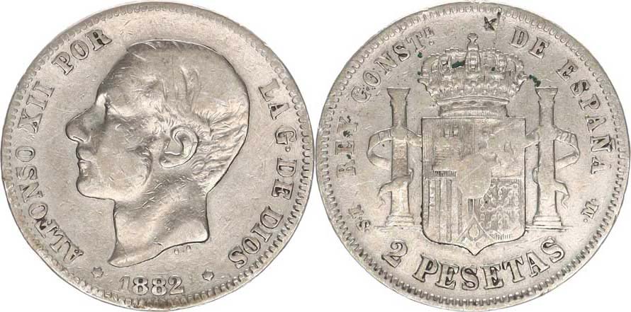 2 Pesetas 1882 MS-M Ag 835 10 g Cr.76; KM 678 _tém.