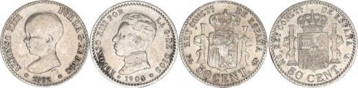 50 Centimos 1892(92) PG-M KM 690 Ag 835 2,5 g 50 Centimos 1904(04) SM-V KM 723 Ag 835 2,5 g 2 ks
