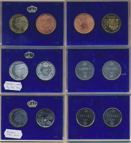 500 Pesetas 1987 - 25.výr. svatby Juana Carlose I. a Sofie +2 návrhy aversu a 2 návrhy reversu +žeton mincovny, vše adjustov áno ve třech plexi pouzdrech +knížečka o 96 str. s barev.fotografiemi celého průběhu ražby "PRUEBA" 6 ks