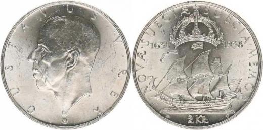 2 Kronor 1938 G - 300 let Delaware, plachetnice KM 807 Ag 8 00 15 g