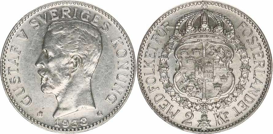 2 Kronor 1938 G - 300 let Delaware, plachetnice KM 807 Ag 8 00 15 g