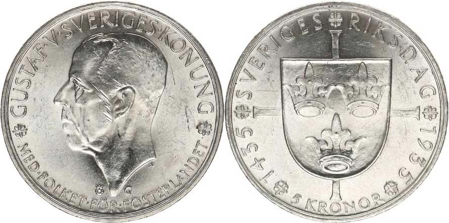 5 Kronor 1935 G - 500. výr. parlamentu KM 806 Ag 900 25,00 g