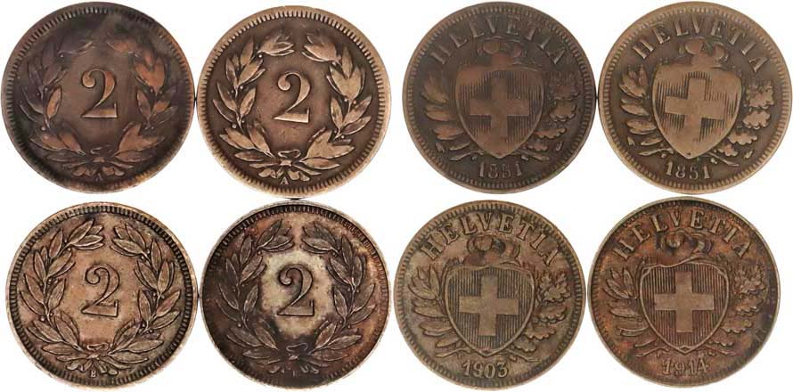 2 Rappen 1851 A (2x), 1903 B, 1914 B 4 ks