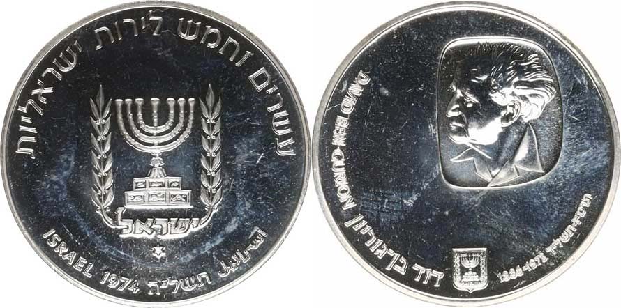 25 Lirot 5735 /1974 AD/ - David Ben Gurion KM 79,1 zn. hvězdi čka, hladká hrana Ag 935 26,254 g