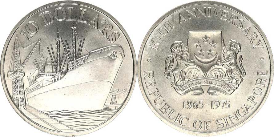 10 Dollars 1975 - 10. výročí republiky, námořní loď KM 11 Ag 500 31,10 g