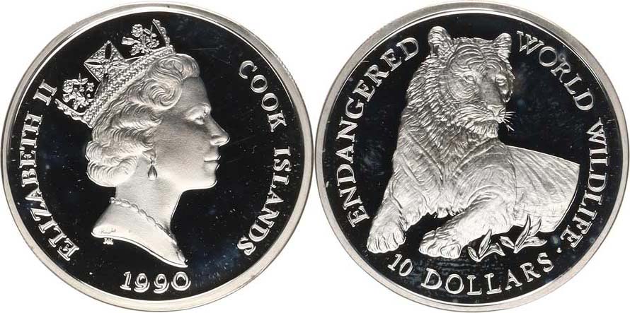 10 Dollars 1990 - ohrožený živočich, Tygr KM 73 Ag 92 5 10,00 g kapsle