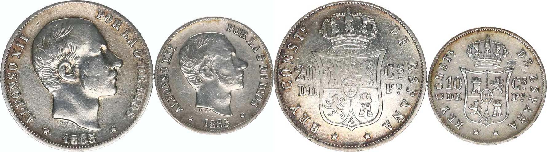10 Centimos 1885 KM 148 Ag 835 2,6 g 20 Centimos 1885 KM 149 Ag 835 5,19 g 2 ks