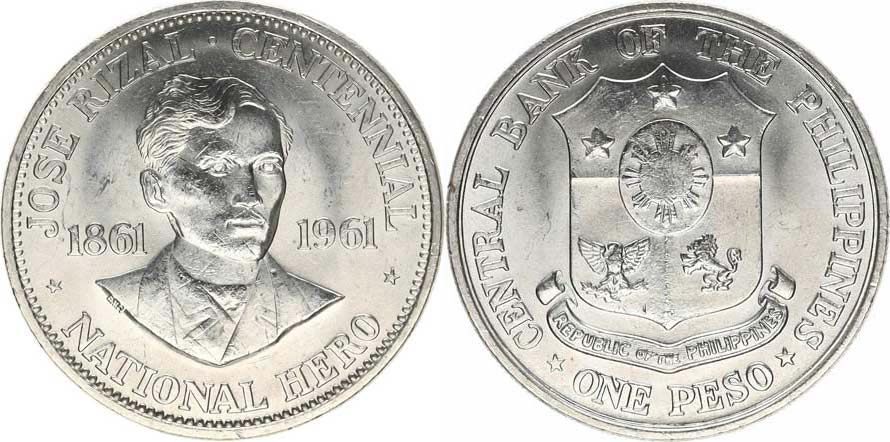 1 Peso 1961 - 100. výr. narození Dr. Jose Rizal KM 192 Ag 900 26 g