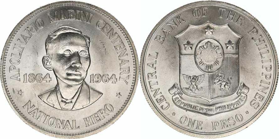 1 Peso 1964 - 100. výr. narození A. Mabini KM 194 Ag 900 26 g_dr. rys.