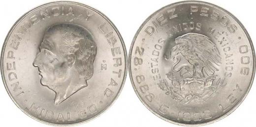 10 Pesos 1956 Mo - Hidalgo KM 474 Ag 900 28,89 g