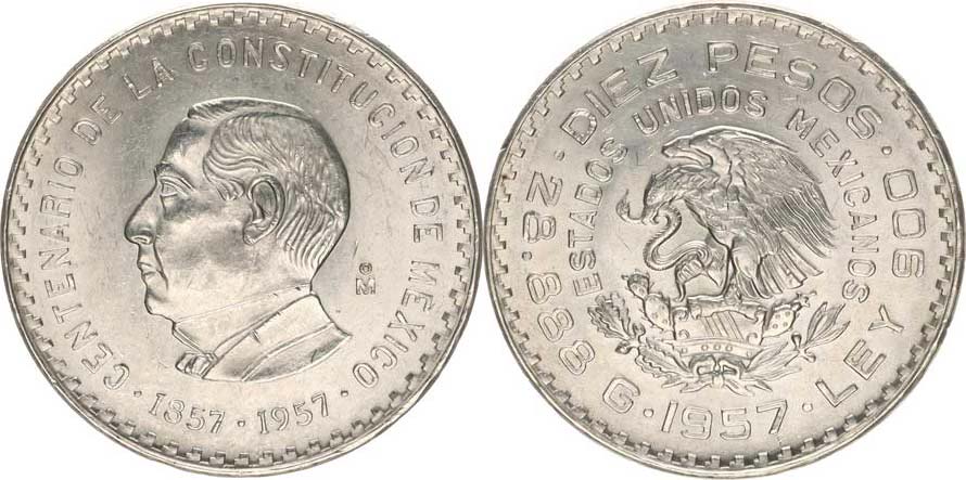 10 Pesos 1957 Mo - 100 výr. konstituce KM 475 Ag 900 28,88 g