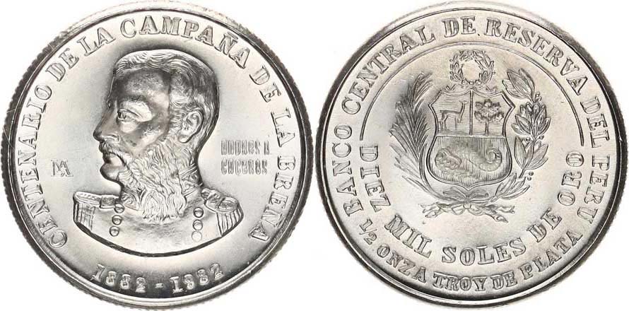 10 0000 Soles de Oro 1982 - Andrés A. Cáceres KM 286 Ag 925 16,81 g ( raženo 100 000 ks)