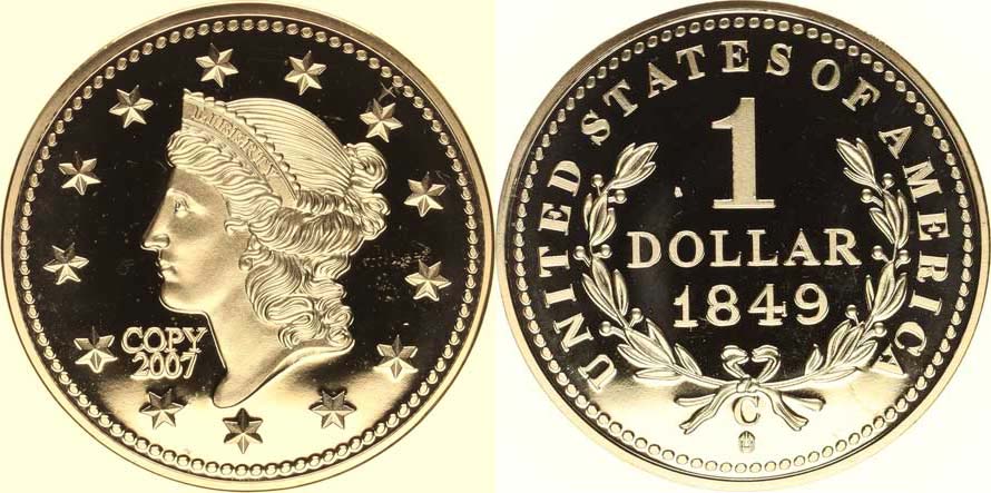 1 Dollar 1849 Liberty "Replika 2007" vydání fy GÖDE pozlac. Cu 40 mm 32 g kapsle +certifikát č. *01625