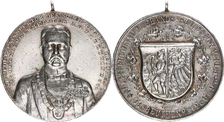 Beuthen (Bytom) - 30. slezské střelby 30.5.-2.6. 1926, Erb ve věn ci, opis / Protektor a starosta města Dr. Brüning, poprsí čelně a opis Ag 35,3 mm 17,11 g původní ouško_dr. rys.