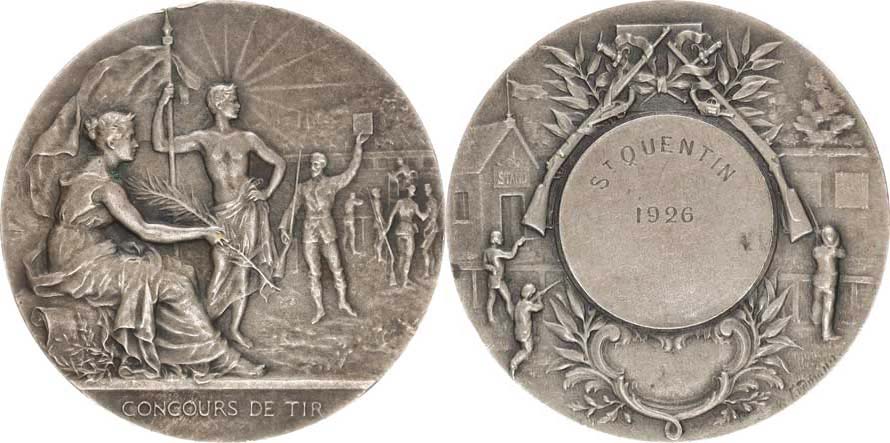St. Quentin - CONCOUR DE TIR 1926 (střelecká soutěž), Av. vlevo s edící žena s palmovou ratolestí, uprostřed muž s praporem, vpravo střelci, ve spodní úseči nápis / alegorie střeleb, uprostřed v terči lokace a datace sign.: A. Erdmann postř. bronz 50 mm 60,40 g