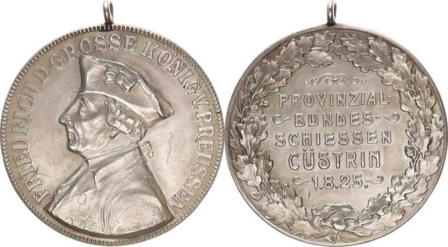 Cüstrin - Zemské spolkové střelby 1.8. 1925. Av. 5ti řádkový náp is v dubovém věnci / Busta krála Friedricha v uniformě zleva, opi s Ag 990 punc na hraně 35,5 mm 23,698 g pův. ouško(aukce Sontag č. 24/ 1298)