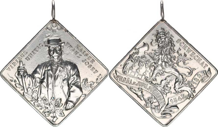 Schwechat - VII. dolnorakouské jubilejní střelby 1542-1893 / císař F.J.I. - VIRIBUS UNITIS Ag klipa 34x34 mm 20,65 g orig. ouško "RR"