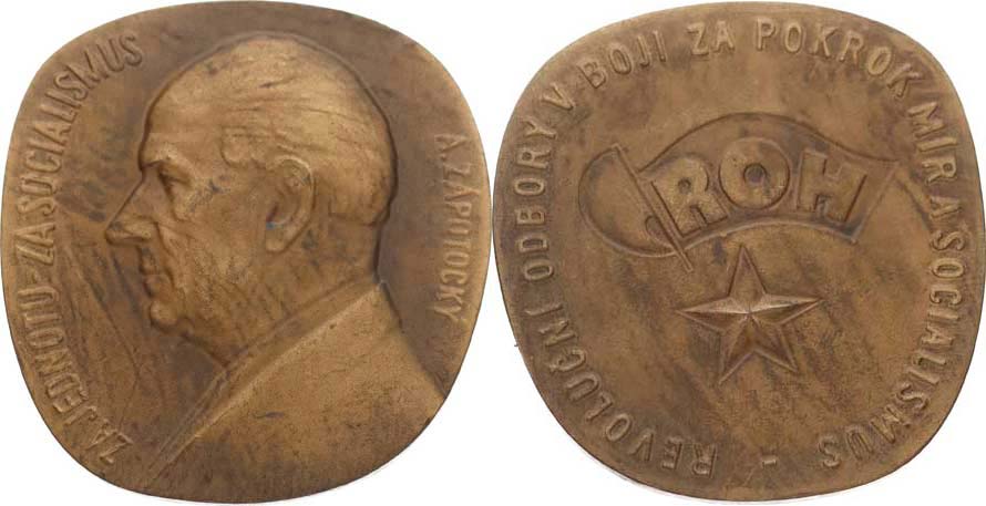 A. Zápotocký, poprsí zleva, opis: ZA JEDNOTU - ZA SOCIALISMUS / R O H, znak, opis: REVOLUČNÍ ODBORY... bronz 60x65 mm 104,20 g Nov.: 05,007c