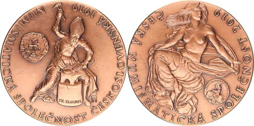 Medaile k 100. výročí založení ČNS 1919-2019, Av. sv. Eligius - patron numismatiků, první denár, opis, vročení 1919 / Polonahá že na s vlajícímy vlasy, žeton s pregéřem, opis, vročení 2019Autor: Mária Filová, minc. Triga Praha Cu 50,5 mm 64,65 g náklad 330 ks etue, certifikát, přebal