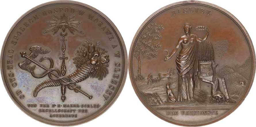 Cís. a král. hospodářská společnost na Moravě a ve Slezsku, roh h ojnosti, Aeskulapova hůl a Boží oko, 3-řádk. němec. nápis a český opis / ZÁSLUZE - DEM VERDIENSTE - stoj. bohyně Ceres, atributy zemědělství a obchodu, sign.: I.WEISS F. bronz 62 mm Fr. +S 5071 původní etue