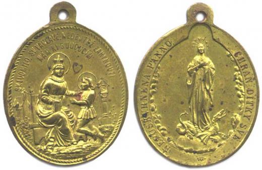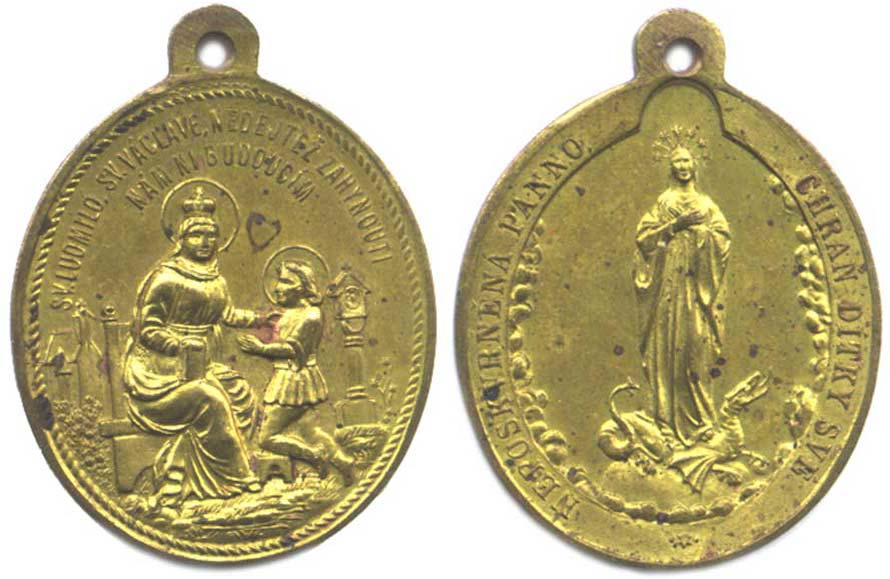 Praha 1 Staré Město - Farní kostel sv. Jiljí u kláštera Dominikán u v Husově ulici. Mariánská družina A: Panna Maria Immaculata / S v. Ludmila sedí zprava, před ní klečí sv. Václav, v pozadí kostel a Boží muka mosaz 28,5x33 mm Přibil 392