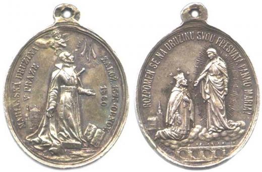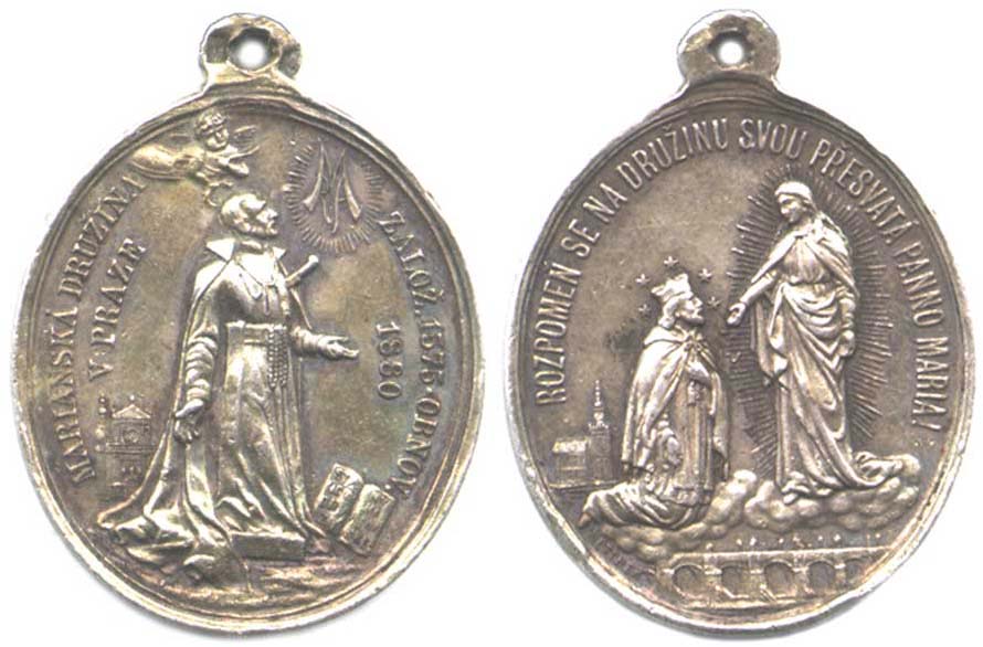 Praha 2 Nové Město - Mariánská družina u kostela sv. Ignáce s Jez uitskou rezidencí, Ječná ul. a Karlovo nám. Založena 1557, obnove na 1880. A: Sv. Edmund Kampián (1540-1581) jezuita, v pozadí chrám sv. Víta v Praze sign.: KETTNER Ag 29x34 mmPřibil 416