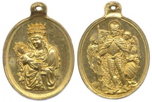 Stará Boleslav - Panna Maria Staroboleslavská, bez opisu / Postav a sv. Václava v brnění s knížecí korunou, v pozadí dva andělé sign.: KŠ (Karel Šmakal) mosaz zlacená 24,5x29 mm Přibil 220