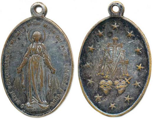 "Zázračná medaile" - jeden z nejstarších exemplářů ražených kolem r. 1868 sign.: PENIN PONCET A LYON postř. mosaz 21x30 mm p ův. ouško
