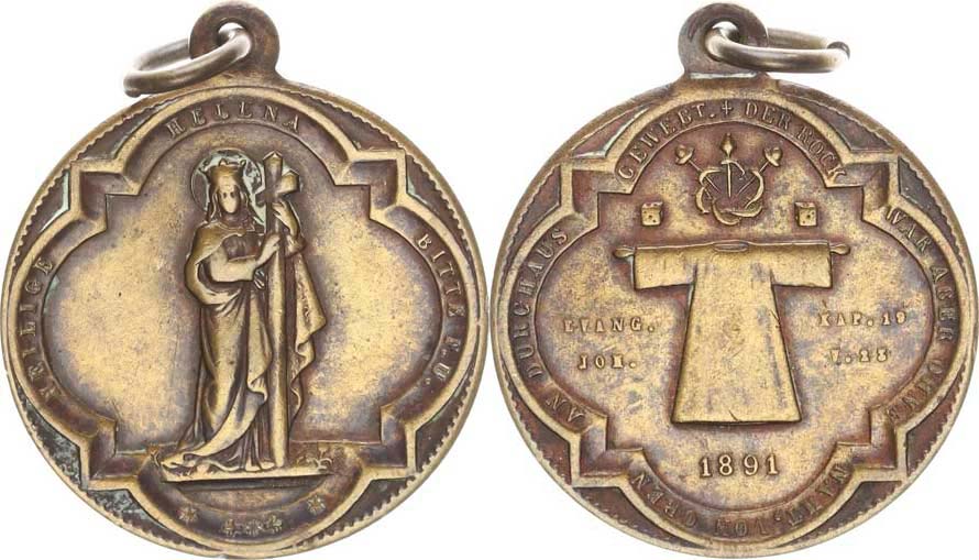 Sv. Helena, stoj. postava / roucho a atributy umučení Ježíše, dat ace 1891 orig. ouško +závěs mosaz 32 mm