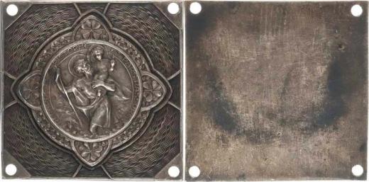 Sv. Kryštof - jednostranná medaile, Stoj. světec drží v levé ruce hůl, druhou pozvedá Ježíše, opis bílá kov. klipa 32,5x32,5 mm amulet pro adjustaci do auta
