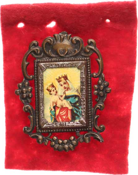 Odznak s litografickým obrázkem Panny Marie v Cu ozdobném rámečku 30x40 mm