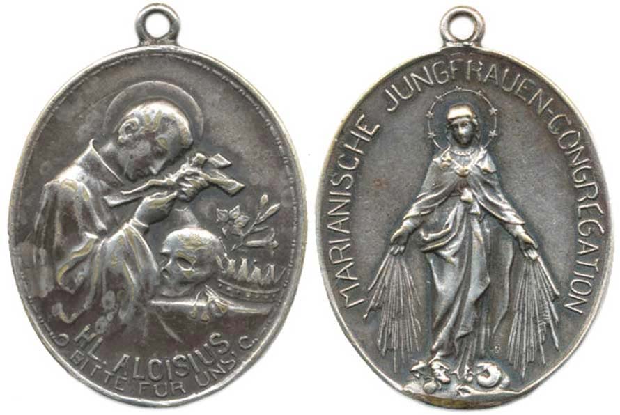 Jezuité - Mariánská kongregace. A: Panna Maria Immaculata podle z jevení Kateřiny Labouré / Poloviční postava sv. Aloise sign: D mosaz postříbřená 27x33 mm