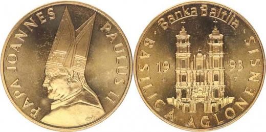 Lotyšsko - Aglona; Papež Jan Pawel II. / Bazilika Aglonensis 1993 mosaz 40 mm kapsle
