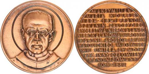 Polsko - Maxmilin Maria Kolbe (františkán - zemřel v Osvětimi, ka nonizován 10.10. 1982). A: Poprsí čelně, bez textu / R: Dvanástiř ádkový polský nápis Cu 45 mm