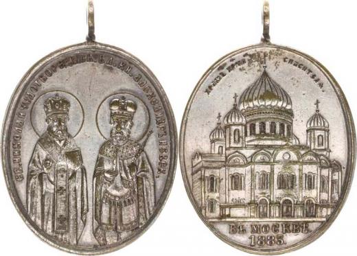 Rusko - Na otevření chrámu Krista Spasitele v Moskvě 1883, Chrám, opis a nápis / Postavy sv. Nikolaje Divotvorce a sv. Alexandra Ně vského čelně, opis postř. bronz. ovál 24,5x41 mm pův. ouško