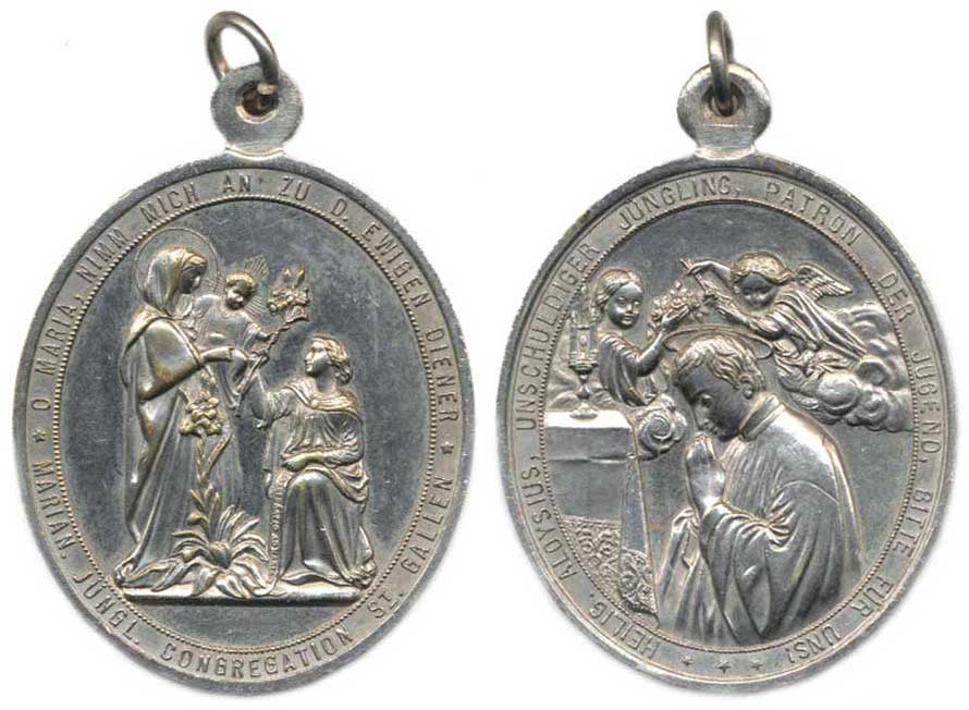 Švýcarsko - St. Gallen, Mariánská kongregace jinochů. A: Ježíšek v náručí stojící Panny Marie přijímá lilii od sedící dívky / Ador ující sv. Alois před monstrancí, nad jeho hlavou dva andělé s květinami Alpaka 36x42 mm orig. ouško +závěs