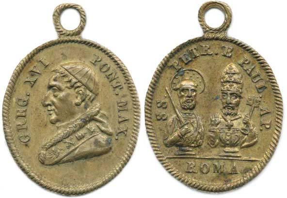 Vatikán - Řehoř XVI. (1831-1846), Pontifikální medaile b.l. A: Po prsí papeže zleva, opis / Busty apoštolů Petra a Pavla čelně, opi s mosaz 24,5x28 mm pův. ouško