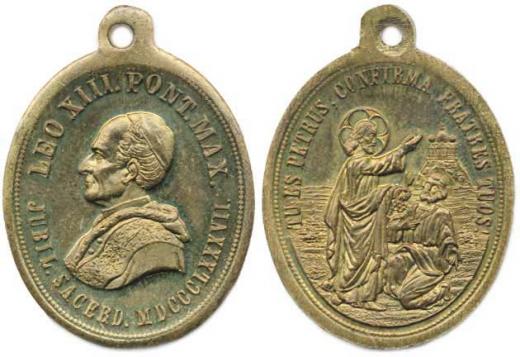 Vatikán - Lev XIII., 50. výr. kněžského svěcení 1887, A: Poprsí p apeže zleva, opis / Kristus předává klečícímu sv. Petrovi pověřen í a klíče mosaz 26x31 mm pův- ouško