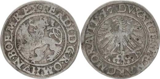Groš slezský 1547 b.zn., Vratislav-Westermaier jako MKČ 155 ale jiná kresba koruny a ocasu lva, za datací tečka, opis: DVX. SILESIAE. MARC. MORAVI 1547. (bez tečky za MORAVI)