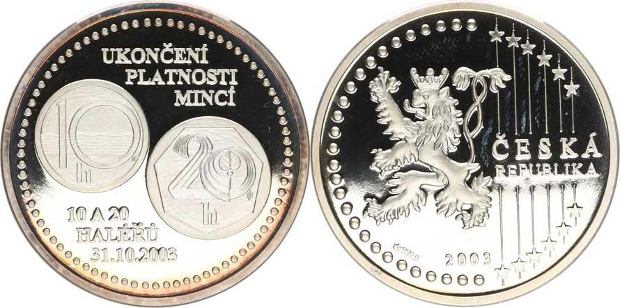 "Ukončení platnosti mincí 10 a 20 haléřů 31.10. 2003" Ag 999,9 35 mm 17,5 g etue +certifikát č. 000179