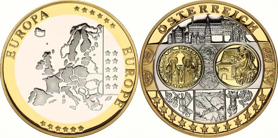 EUROPA, Mapa sjednocené Evropy / Rakousko bimetal 40 mm 20 g nepumcováno kapsle