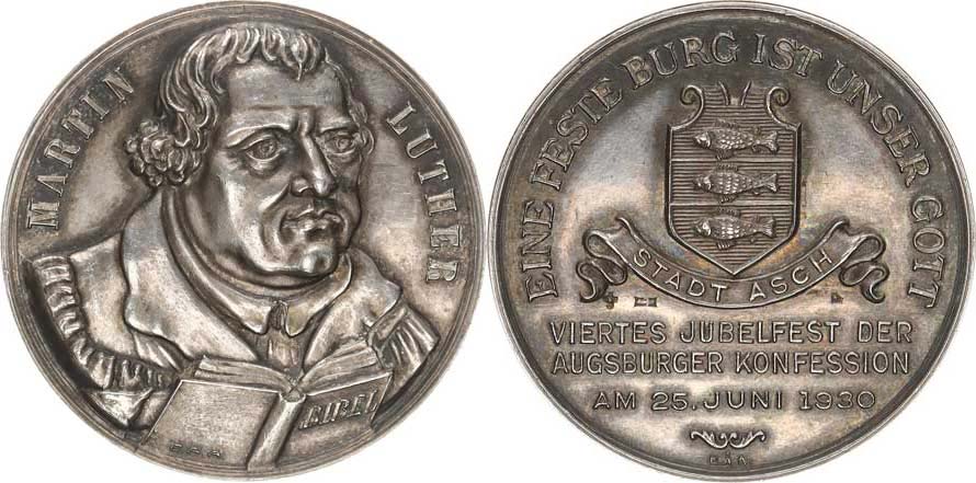 Martin Luther, poprsí reformátora téměř čelně s Biblí, opis / Erb města Aše, nápis ve stuze, opis: VIERTES JUBELFEST DER / AUGSBURG ER KONFESSION / AM 25. JUNI 1930 sign. E. A. A. Ag 40 mmpunc 34,533 g "R"
