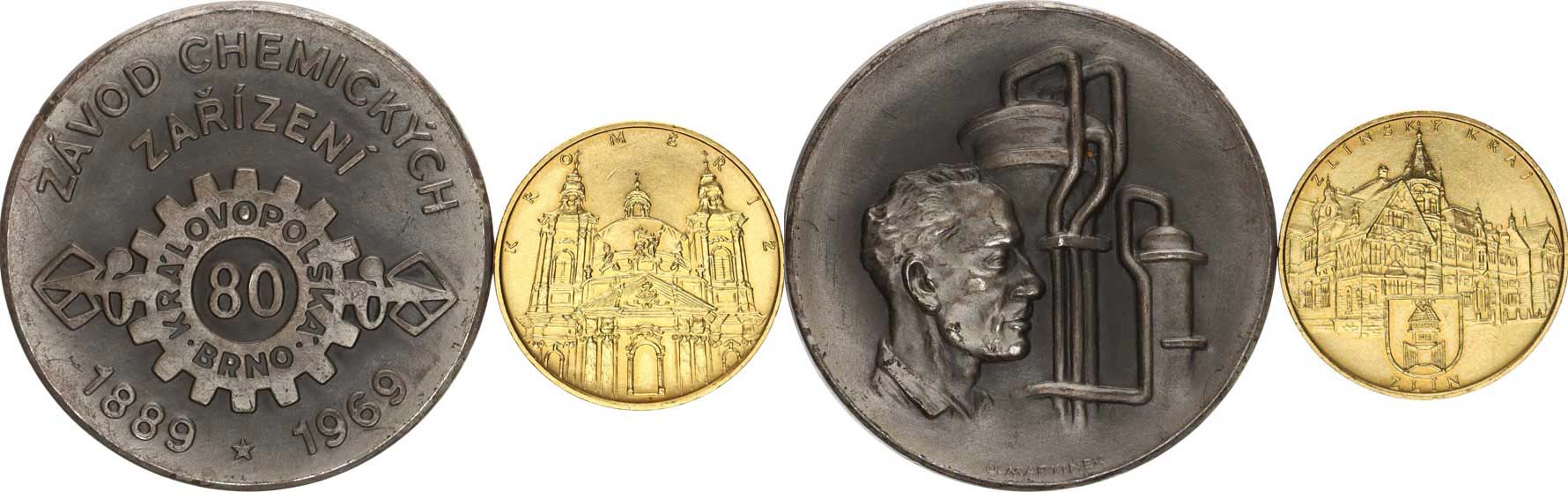 Královopolská Brno "80" závod chemických zařízení 1889-1969, logo fy. a opisy / chemické zařízení a portrét pracovníka sign.: O. Martínek postř. bronz 50 mm2/ Kroměříž, portál zámku / Zlínský kraj - Zlín zlac. kov 30 mm 2 ks